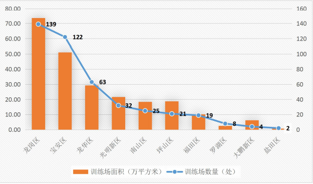 按照训练场数量和总面积统计,龙岗区训练场最多且面积最大, 共有 139 处合计 73 万余平方米,占全市训练场总面积的 31.61%;其 次是宝安区,共 122 处合计 51 万余平方米,占全市训练场总面积的 21.92%。