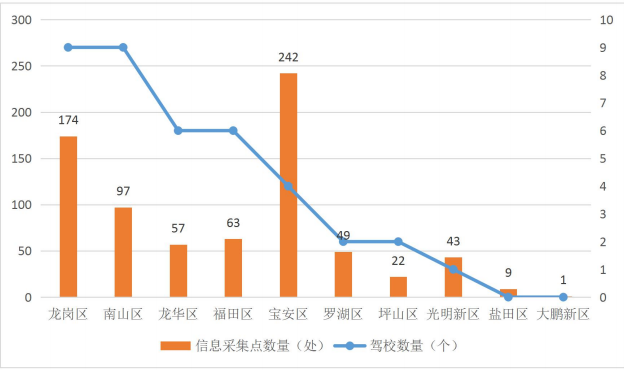 按照注册地统计,龙岗区和南山区驾校数量最多,盐田区和大鹏 新区没有驾校注册。39家驾校在深圳市共设置了 757 处信息采集点, 其中,宝安区有 242 处信息采集点,占全市信息采集点总数的 31.97%, 全市各区最多。