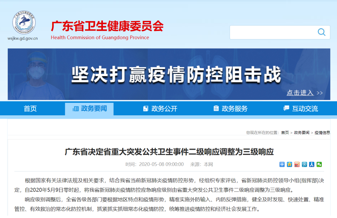 最新消息!自2020年5月9日零时起,将我省新冠肺炎疫情防控应急响应级别由省重大突发公共卫生事件二级响应调整为三级响应