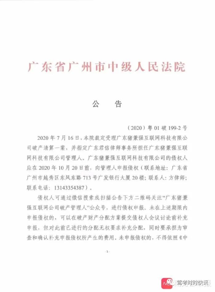 猪兼强是广东有名的驾校之一,曾号称要用互联网改变驾培行业,但由于经营不善,最终负债累累走向破产。2020年7月16日,广州市中级人民法院裁定受理广东猪兼强互联网科技有限公司破产清算一案,并指定广东君信律师事务所担任本案管理人,案号为(2020)粤01破199号